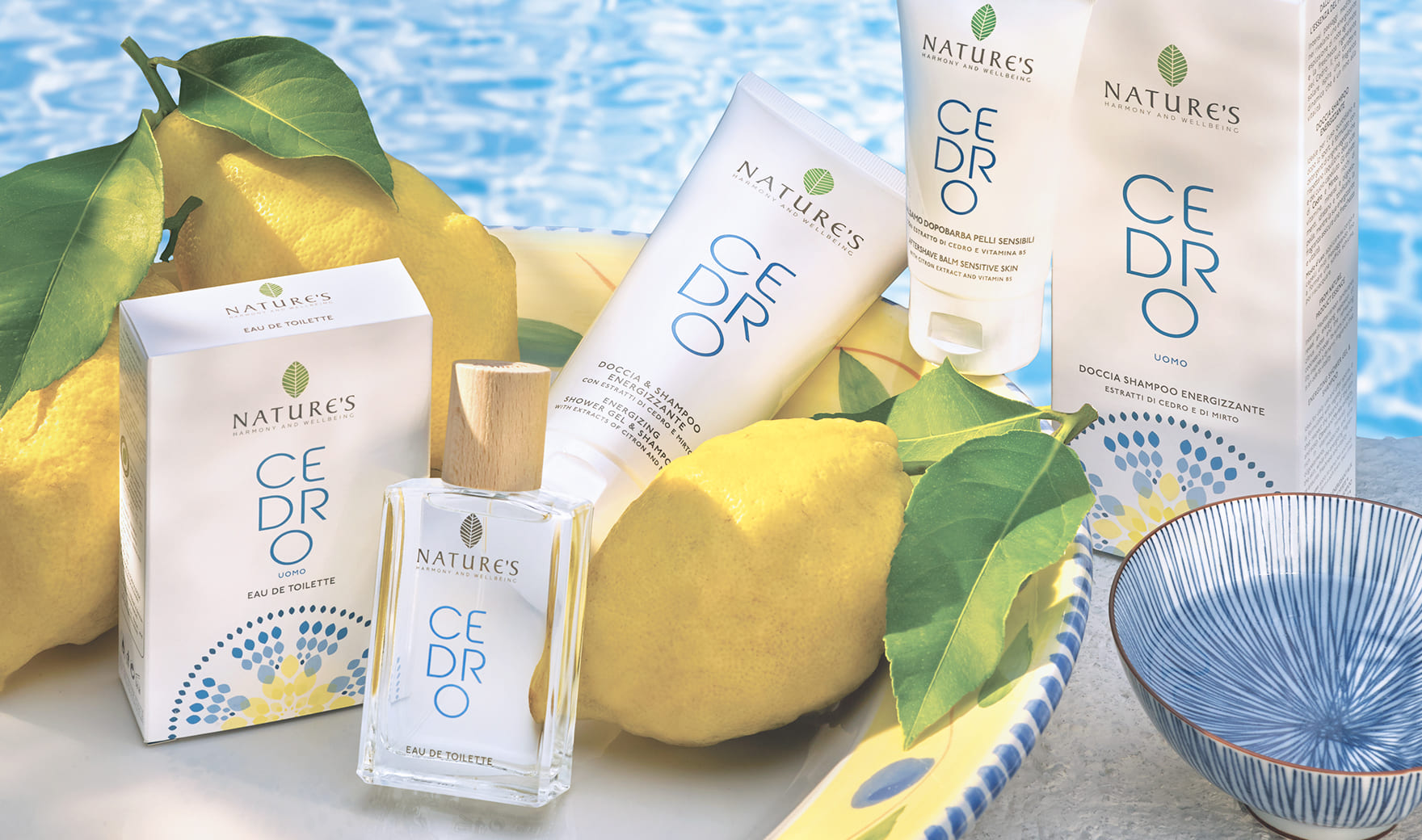 Fresca e agrumata, una linea di prodotti cosmetici per uomo composta da profumo, dopobarba per pelli sensibili, doccia shampoo e deo con estratti di Cedro ricco di minerali per energizzare la pelle maschile.