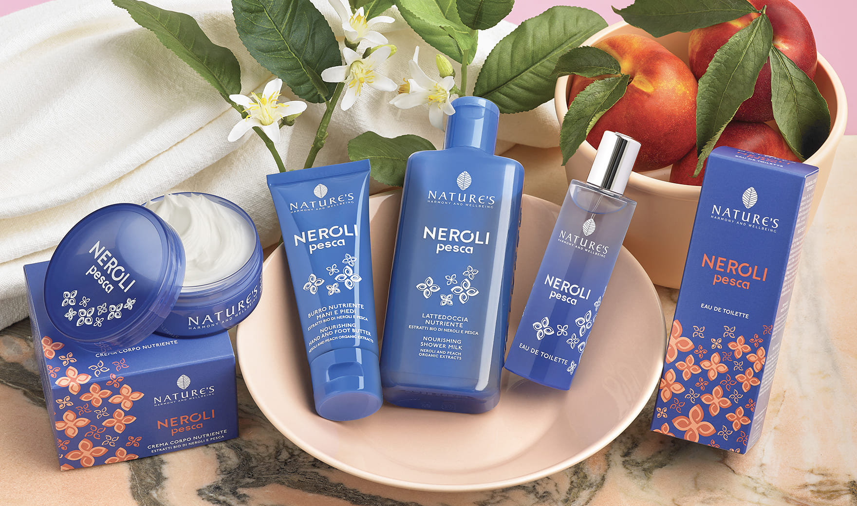Un’avvolgente linea di cosmetici naturali al profumo di Neroli e Pesca. Regalano alla pelle la freschezza agrumata e la dolcezza della frutta, lasciando una scia di accordi ambrati. Il lattedoccia, l’eau de toilette, la crema corpo e quella mani e piedi sono formulati con ingredienti naturali che ne assicurano la massima efficacia e tollerabilità cutanea.