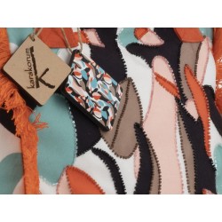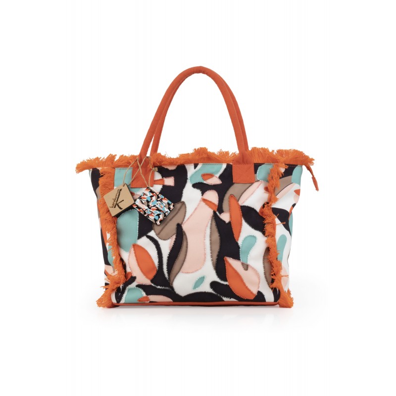 Borsa NUMA rettangolare in tessuto stampato e doppio manico semi rigido. Chiusura con zip e taschine interne. Sfrangiata su tutti i bordi. Decoro di perline sul davanti. Foderata.Targhetta pirografata e pendente, in legno, con logo Karakorum.