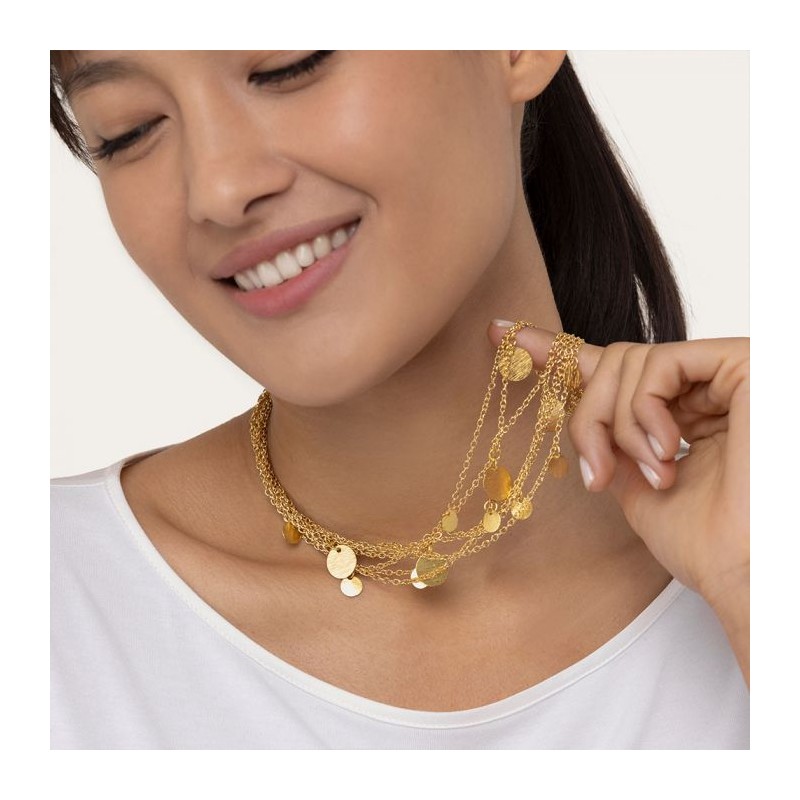 Collana in ottone multicatene. Le catene sono arricchite da pendenti di varie dimensioni a forma di moneta. Chiusura regolabile con moschettone. Lunghezza 38 cm. Lunghezza extra chain 6,5 cm. Nickel tested. Gioielli fatti a mano, unici e artigianali, perfetti per tutti i tuoi look o come idea regalo.
