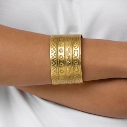 Bracciale in ottone modello fascia. Il design del bracciale è ispirato ai geroglifici dell'Egitto. Le incisioni e i dettagli sono realizzati completamente a mano. Altezza 4 cm. Diametro regolabile base 6,5 cm. Nickel tested. Gioielli fatti a mano, unici e artigianali, perfetti per tutti i tuoi look o come idea regalo.