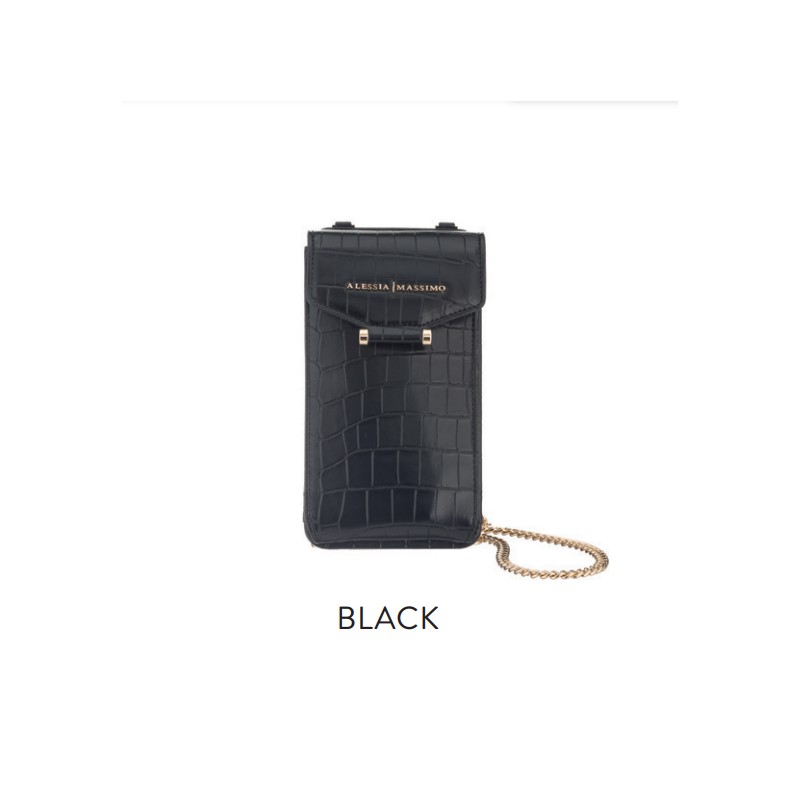 Elegante portacellulare di Alessia Massimo in similpelle con stampa coccodrillo è il complemento perfetto per la sua borsa coordinata ma utilizzabile anche da solo. La finitura dettagliata e la chiusura con bottone a pressione dorata ne fanno un portacellulare unico. Inoltre, ha uno scomparto esterno con zip per monete e banconote