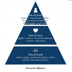 In testa, brezze anisate trasportano profumo di iodio e agrumi, combinati con gli aromi selvatici dei cespugli di santoreggia e lavanda cresciuti sul mediterraneo. Nel cuore si espandono intense note di giglio costiero e salicornia che, nel finale, lasciano spazio ad una speziata e balsamica scia di legno di cedro, patchouli e muschi di mare rendendo il profumo persistente e continuativo.