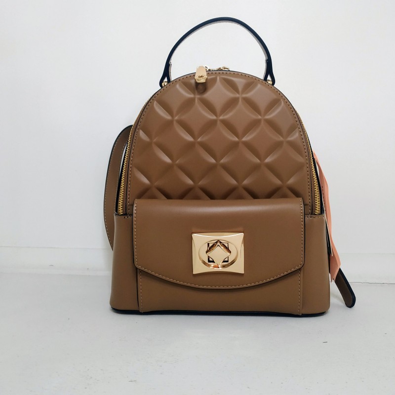 Zaino donna elegante firmato Alessia Massimo, un accessorio perfetto per aggiungere un tocco glamour al tuo stile quotidiano. Realizzato in eco pelle color taupe, questo zaino unisce praticità e raffinatezza grazie alla sua lavorazione trapuntata a rilievo e ai dettagli metallici color oro.